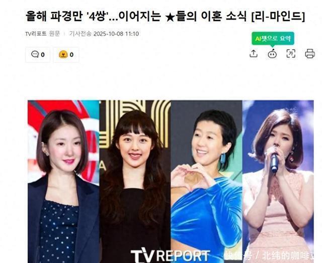 2025年才过十个月,韩国娱乐圈的“离婚潮”却已悄然袭来,接连四对明星夫妇分道扬镳的消息,一次次冲击着大众的认知。10月8日,有韩国媒体盘点了2025年离婚的四位韩女星,从八年夫妻到十一个月短婚,从低调协议到冷冻胚胎引发的伦理争议,每一桩都堪称“韩娱年度大戏”。